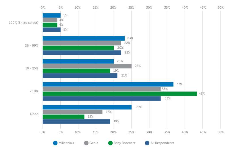 • Baby Boomers (ages 59-77): While medical professionals of the Baby Boomer generation have participated in locum tenens work, they are more likely to seek stability as they approach retirement. Many have dabbled in contract work, with less than 10% of their careers spent in these roles. They demonstrate a preference for traditional, long-term employment as they near the end of their careers.